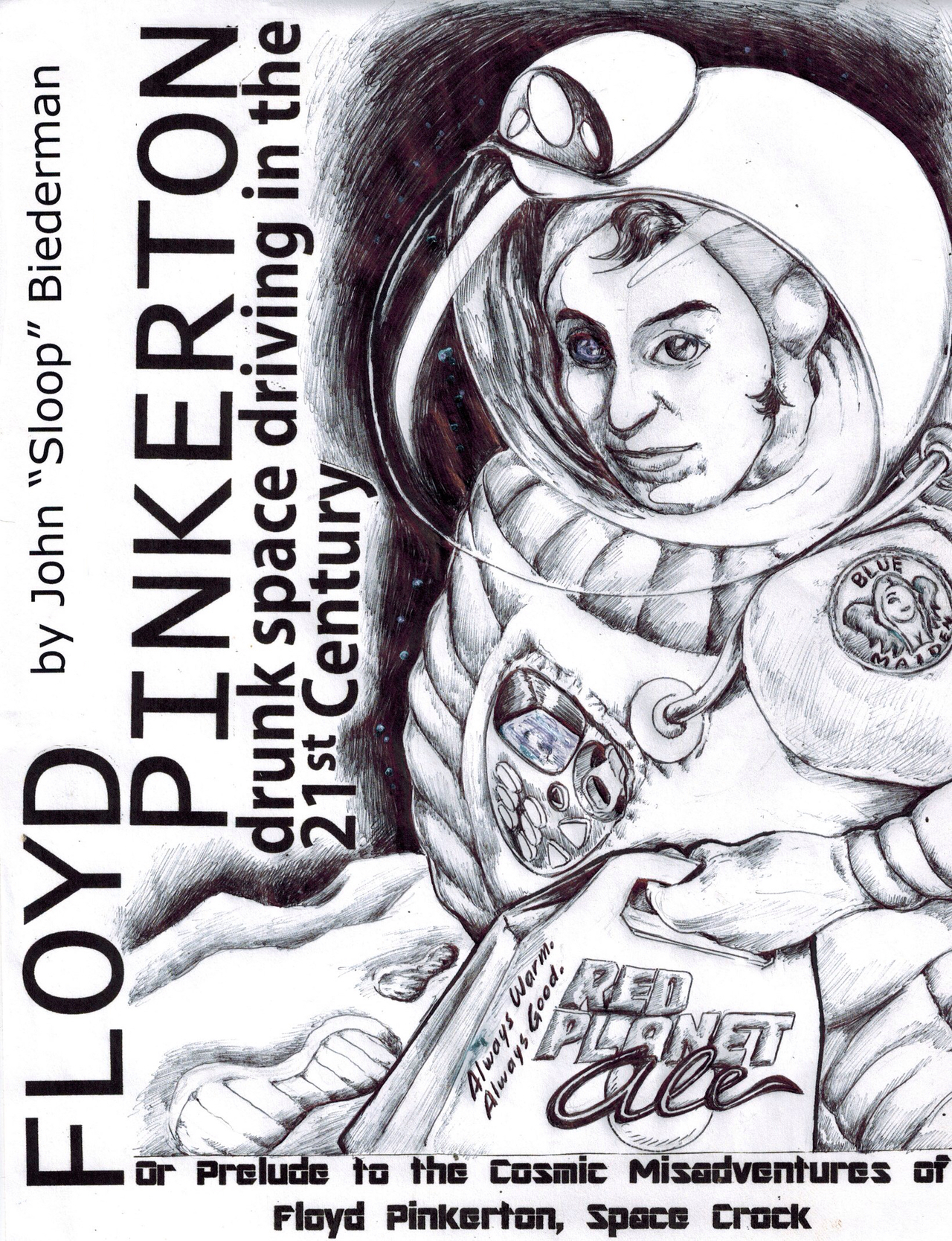 (Available as free ebook download at http://www.smashwords.com/profile/view/JohnSloopBiederman)The story opens in the year 2091 with hard drinking, cigar smoking Floyd Pinkerton spiraling out of control in an unknown planet’s atmosphere. Through flashbacks, readers learn that Floyd stole the craft (the Blue Maiden) from his employer on Jupiter’s moon, Ganymede--running away from a broken relationship and unsatisfying life. Tailed by the Sun System Sheriff, he hurriedly executes a “jump” through space (using astrogation to travel large distances) and lands smack into the Place That Should Not Be’s (his name for the planet) atmosphere. The Maiden crashes to the surface. He’s unable to budge the craft and, not mechanically inclined, thus stuck. Fully loaded for weeks with rations, booze and stogies, for a while he drinks, engages in shenanigans and wallows in his fate before turning on a distress beacon (praying to not attract “authority types”) and, via ship computers, assessing the planet outside--a low-gravity ice world. He finally ventures out to explore after hearing a large “crash,” his suit outfitted with a PCAH (Personal Consumption Airlock Helmet, allowing one to drink, smoke, etc.). He finds that another craft has crashed to the surface, an alien-looking, banana-shaped model. Could he be the first human to encounter alien life?... Turns out the craft was piloted by an old Earth nemesis of his, Bob Tripeman, who claims he obtained it from an insect-like alien race, the Zzurkwins, which Floyd highly doubts. Deciding that “Cruizy Suzy” (Bob’s name for the banana-shaped ship) is the only one fixable, Bob gets to work, mooching booze and smokes while taking his sweet time and continually rehashing/exaggerating an Earth-based event back in high school where Bob “saved” Floyd’s life. (Floyd crashed a ground car into a snowy ditch and was stuck. Walking to find help, Bob picked him up and proceeded, for weeks, to milk his “saving” Floyd by mooching booze, smokes and more.) They also share general memories of their childhoods on Earth, now an overpopulated world wherein America has been overtaken by the Crescent Jihad, a militant Islamic group that simply walked in and conquered, with most U.S. citizen zombified by smart devices and even Smart Brain Chips (SBCs). Eventually, they launch Suzy back into space, where they are soon attacked by Zzurkwins, who actually board, wanting their craft back (Bob’s explanation of the turn of events is suspect and short on details). What’s more, Tri-World authorities (Earth, Luna and Mars, the Sun System bodies with appreciable human colonization) make radio contact, wanting them both to turn themselves in! Floyd and Bob attempt to lose their pursuers by piloting an escape pod (large enough to hold most of their supplies) into a nearby asteroid belt, landing upon a large ’roid that happens to house an observatory. Via computers controlling multiple telescopes, they discern the Zzurkwin home planet nearby within the system along with, having little choice, their next destination, a habitable moon of the Zzurkwins’ world curiously populated by…human beings? Just before embarking upon this next leg of their on-the-lam vacation, they stumble upon a remote, real-time feed of a familiar planet--and witness a rather dire fate for their beloved Mother Earth! This book serves as a prelude to a novel series, The Cosmic Misadventures of Floyd Pinkerton, Space Crock.